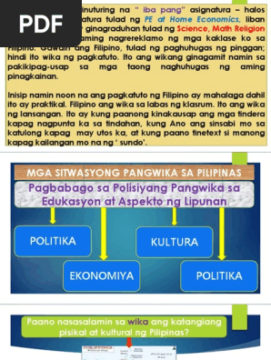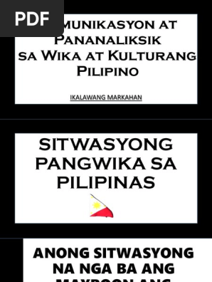Iba't ibang sitwasyong pangwika sa pilipinas pdf. Heterogenous ang sitwasyong pangwika sa. 37 Full PDFs related to this paper. 2 Iskedyul Linggo Paksa Kompetensi Kasanayan Unang linggo Mga Sitwasyong Pangwika sa Pilipinas - Mga Sitwasyong Pangwika - Sitwasyong Pangwika sa Iba Pang Anyo ng Kulturang Popular Natutukoy ang ibat ibang paggamit ng wika sa mga napakinggang pahayag mula sa mga panayam at balita sa radyo at telebisyon F11-PN-IIa-88 Natutukoy ang ibat.